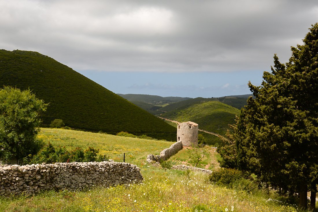 Het was een flinke rit naar het klooster van Spiliotissa en daarom maakten we onderweg enkele korte tussenstops. Bij Kampi om van het uitzicht op de kliffen te genieten en de Myceense begraafplaats te bekijken. In Exo Chora stapten we even uit bij de enorme olijfboom die prachtig in bloei stond. In Orthonies dronken we koffie met sinaasappelcake, een weldaad voor mijn zere keel. Ineens hief Spiros zijn vinger op: de paasprocessie kwam eraan! We stoven naar de kant van de weg en inderdaad: de priester met een groot kruis en daarachter een stoet dorpelingen kwam langs. Zo kregen we toch nog iets mee van het paasfeest. Naast het kafenion was ook een leuk klein museum met gebruiksvoorwerpen en traditioneel ingerichte kamers.Spiros bleek niets te veel te hebben gezegd over het klooster. Het lag op een schitterende locatie, in een dal waar de velden uitbundig in bloei stonden. Terwijl de rest van het gezelschap over het binnenterrein van het klooster dwaalde, maakte ik hoestend en proestend foto’s van een oude windmolen en olijfbomen tussen de bloemen, de lichtgroene heuvels op de achtergrond. Ik vond het zo’n mooie plek dat ik er nog uren had kunnen blijven. Het bezoek aan het klooster was hiermee een waardige afsluiting van drie enerverende dagen. Met lichte tegenzin stapten we in de auto voor de terugrit naar Vasilikos.