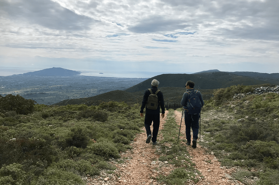 Het weer slaat s ’nachts om, desondanks worden we de volgende ochtend gewoon opgehaald door onze gids met een vrolijke smile en de boodschap “the plans have changed”. Spiros laat ons zijn eiland zien, het eiland waar hij is geboren en getogen, wat hij tijdelijk heeft verruild voor de hoofdstad en waarnaar hij nu weer is teruggekeerd. I.p.v. te wandelen worden we door het onbekende binnenland geleid, langs verstilde bergdorpjes en eeuwenoude olijfbomen. We blijven stijgen tot ons bij Agalas een prachtig viewpoint over de grillige kustlijn en het vasteland verderop wacht. Daar genieten we van een heerlijke kop koffie, geschonken door uitbater Adonis, en zijn we stil van het onvergetelijke uitzicht.