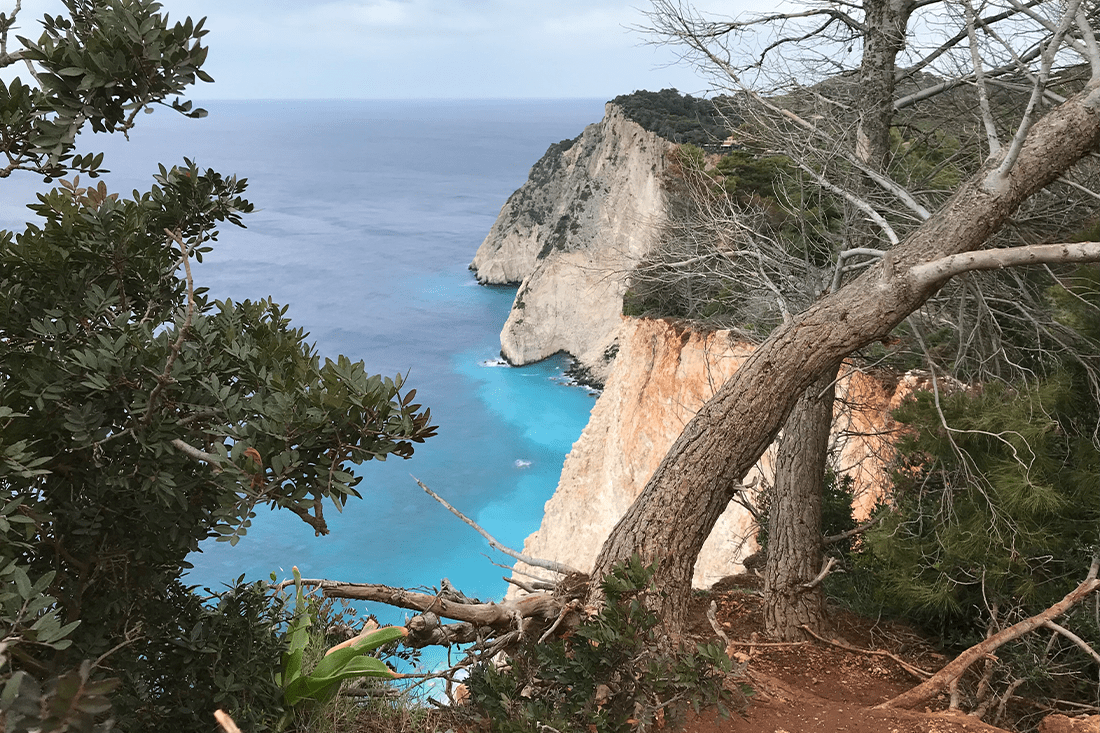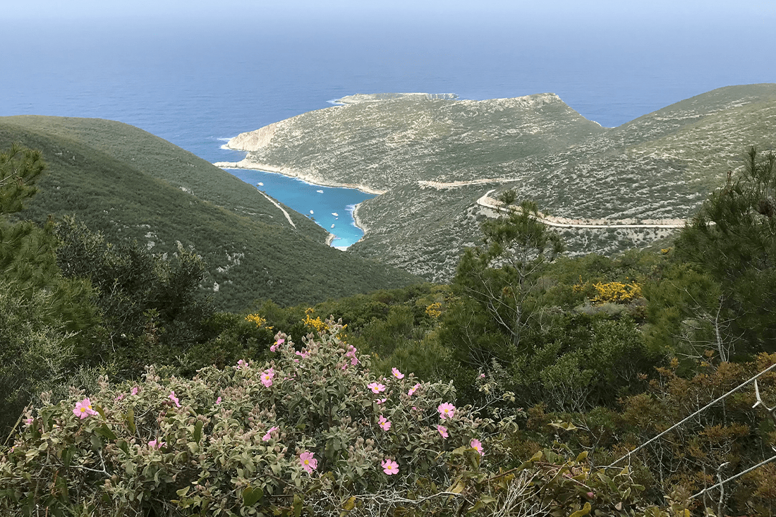 Uiteindelijk bereiken we een adembenemend uitzichtpunt over het hele eiland, de wind suist om onze oren. We zien in de verte onze tijdelijke verblijfplaats, het schiereiland Vassilikos met de kenmerkende rotsformaties bij Gerakas beach.