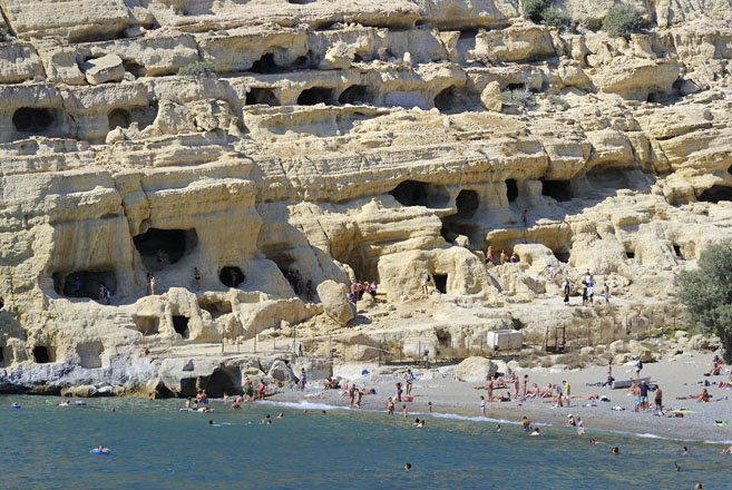 Richting Agia Galini passeren we Ano Vianos, gebouwd tegen het bergmassief. Op het dorpsplein staat een eeuwenoude plataan. Ook de karakteristieke tavernes dragen bij aan het authentieke aanzien van het plein. Vanuit Ano Vianos kunt u de fraaie en stille stranden van Arvi en Keratokambos bereiken. Richting Kokkinos Pirgos komt u door de Messara-vlakte, de meest uitgestrekte en vruchtbare vlakte van Kreta. Kokkinos Pirgos heeft een zandstrand van maar liefst 12 kilometer breed. Verder oostelijk ligt Festos, dat na Knossos werd blootgelegd. Iets verder ligt Gortys met overblijfselen van de stad die ten tijde van de Romeinse en Byzantijnse overheersing de hoofdstad van Kreta was. Ten zuiden van Festos ligt Matala, een plaatsje dat in de jaren ’60 geliefd was bij hippies, die zich hier in de grotten langs het strand ophielden.
