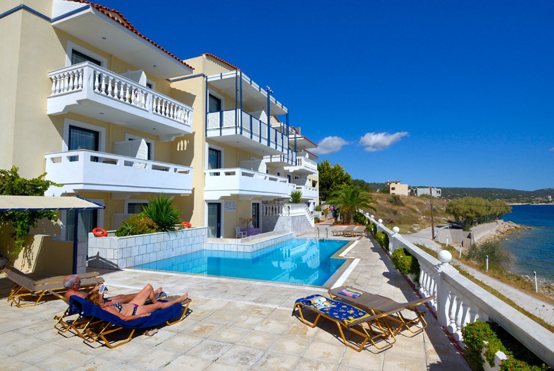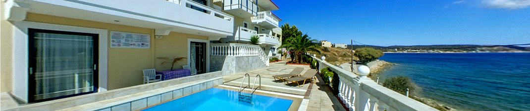 Aan de voorkant van Huize Ostria is een ruim terras met zwembad en ligbedden. Vlak voor Huize Ostria is het mogelijk een duikje in zee te nemen vanaf een smalle strook kiezels. De gastvrijheid van de eigenaar Nikos staat garant voor een fijne vakantie in Huize Ostria. U kunt hen iedere dag vinden bij de receptie of in het moestuintje naast Huize Ostria.