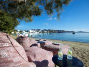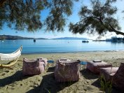 Het strand is direct voor de deur. Hier staan voor de gasten ligbedden en een hangmat om te gebruiken. Naar Pollonia is het 200 meter.