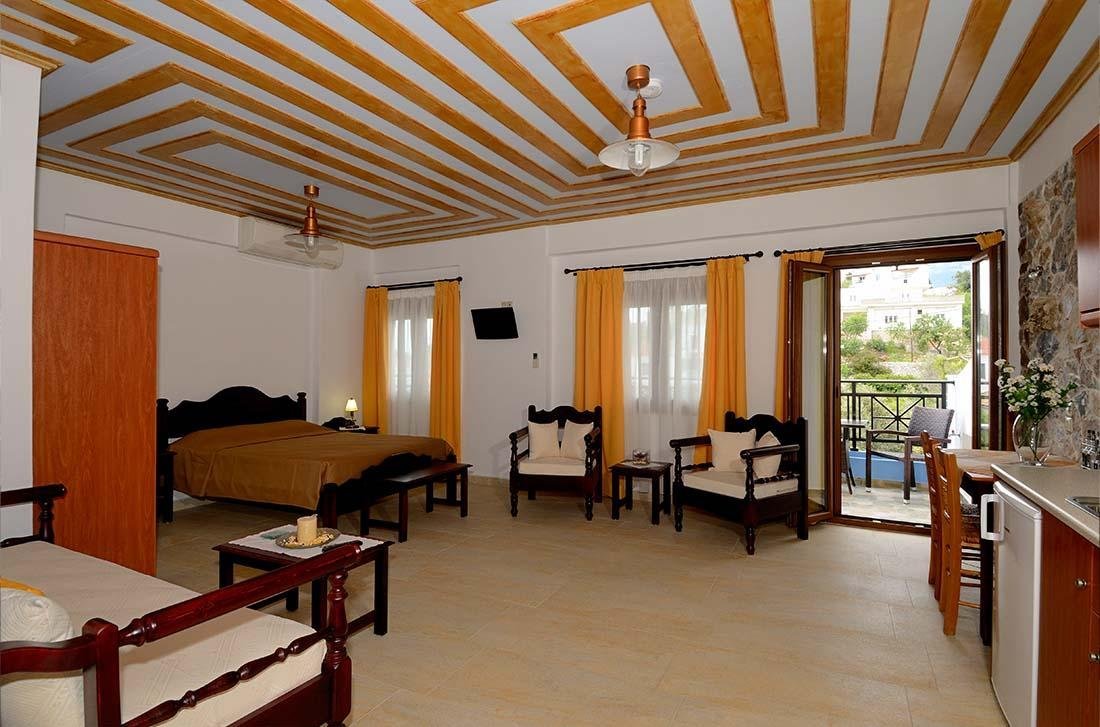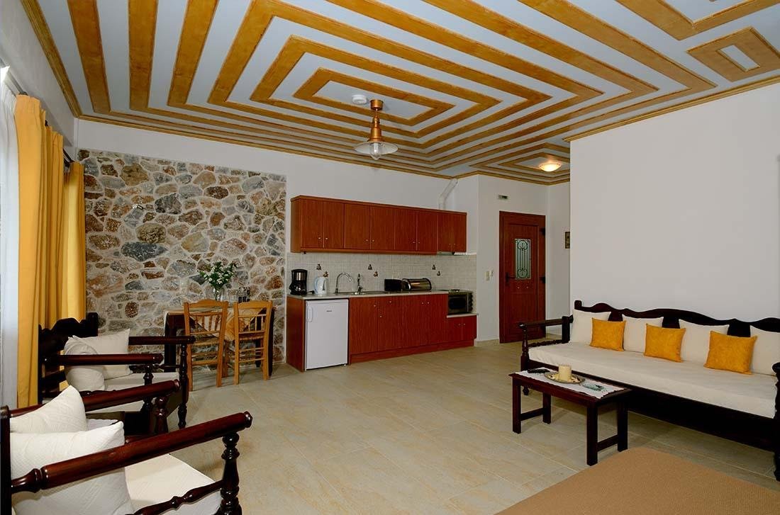 Comfortabel en ruimDe appartementen zijn geschikt voor 2 tot 4 personen. Appartement type A, met de naam Ifestos, ligt op de begane grond, bereikbaar via een lichte helling, en heeft een ruim terras dat omringd is door planten en struiken. Er is een woonkamer met een zithoek waarvan de sofa plaats biedt aan de eventuele derde persoon en voor de vierde persoon wordt een extra bed bijgeplaatst. Dit bed is geschikt voor een kind van maximaal 12 jaar, open keuken, een eethoek, een slaapkamer met twee eenpersoonsbedden, een badkamer met douche en toilet.