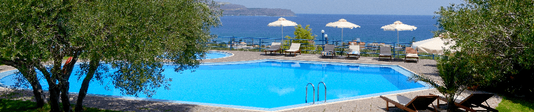 Het grote, onregelmatig gevormde zwembad met apart kinderbadje bevindt zich op het hoogste niveau van Huize Artemis en is via een aantal treden bereikbaar. Het is omringd door een gazon met een terras rondom en biedt uitzicht over de baai van Souda. Er zijn ligbedden en parasols aanwezig.