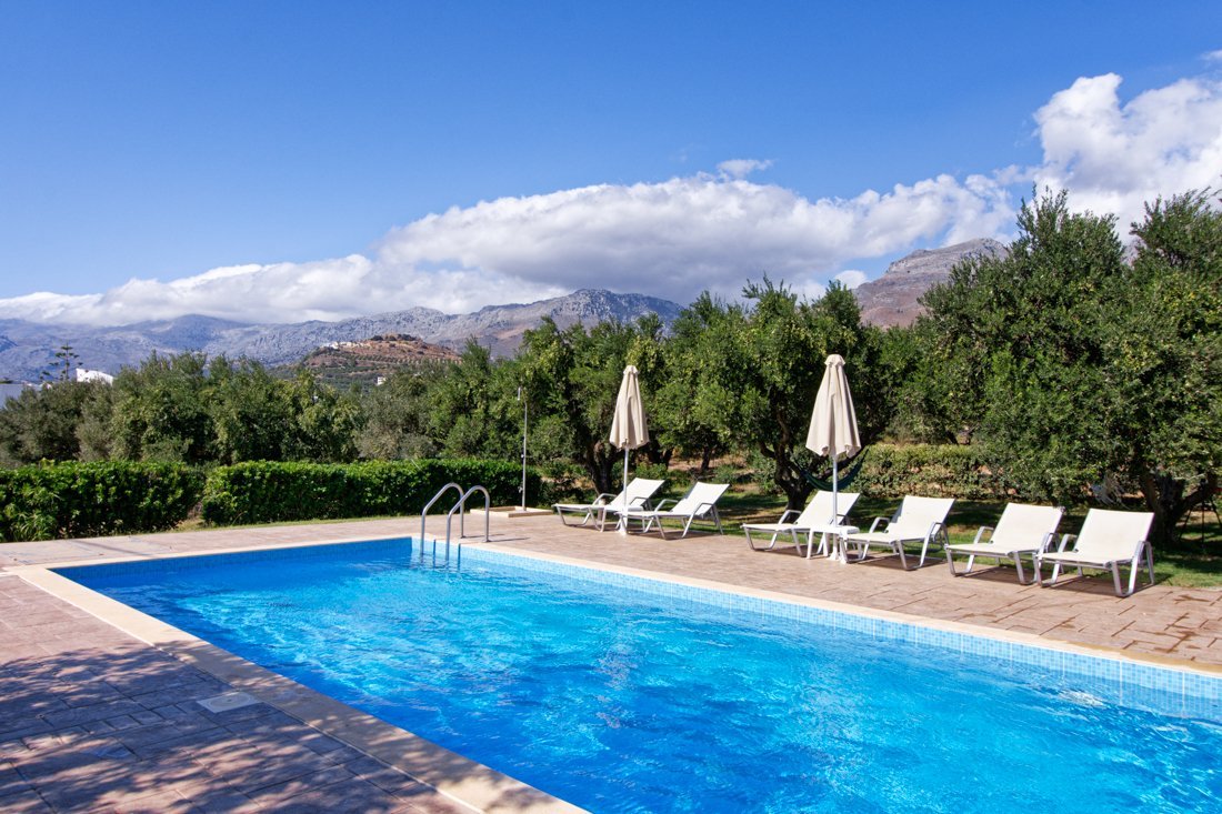Aan de voorzijde is een zwembad met rondom een terras met ligbedden, zitjes en hangmatten. Aan de achterzijde is een grote olijfboomgaard.