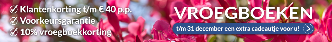 - De getoonde prijs is inclusief boekingskosten € 37,50, bijdrage aan het Calamiteitenfonds van € 2,50 per boeking en consumentenbijdrage SGR Garantiefonds van € 5,- per persoon. Klik op een prijs voor een specificatie.