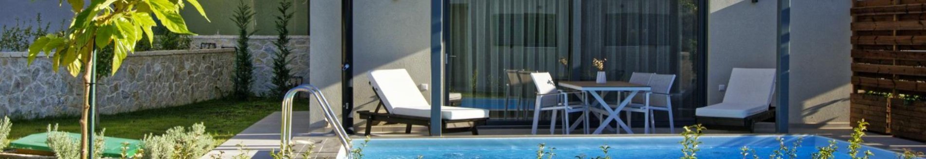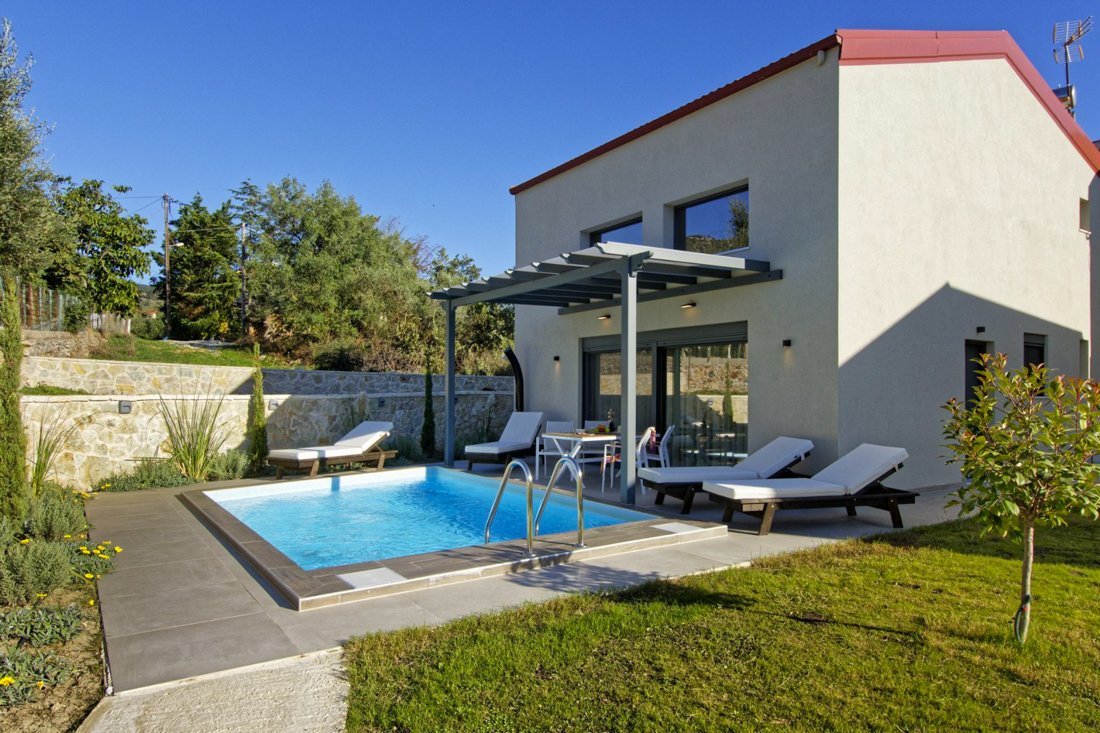 Elke villa heeft een terras met pergola, met een eethoek en een privézwembad met enkele ligbedden op het terras rondom.