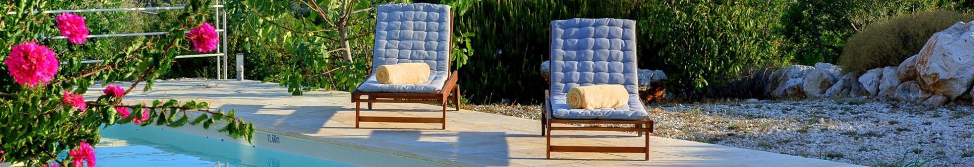 Op het hoger gelegen terras dat grenst aan de woonkamer is een zwembad waar ligbedden omheen staan. Onder een pergola staat een eethoek en er is een ingemetselde barbecue.