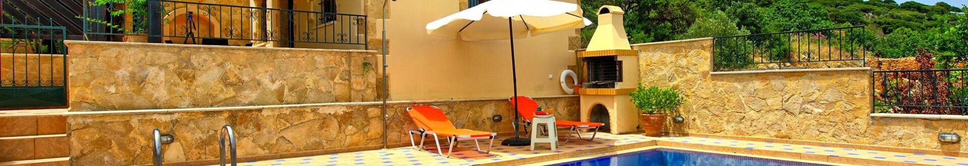 Rustig gelegenEen overdekte patio grenst aan de entree van de villa. Hier staat een buiteneethoek. Een paar treden lager is het zwembad, waar omheen ligbedden en parasols staan. Er is een gemetselde barbecue en vanaf dit terras heeft u uitzicht op de omringende bergen en tot aan de baai van Kolymvari.